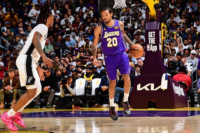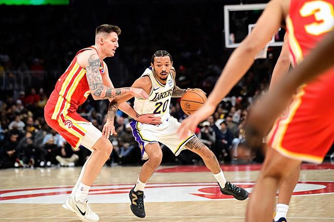 本场比赛中,湖人的替补后场新星小尼克-史密斯(Nick Smith Jr.)难得得到了进入轮换阵容的机会,他的表现绝对算得上是令人眼前一亮。史密斯全场出场14分17秒,投篮7中4,三分线外3中3,罚球3中2,得到了12分2篮板2抢断的数据,没有出现失误和犯规,正负值则是达到了全场最高的+6。史密斯在进攻端展现出了全面的得分能力,他的进攻效率也是能够保持在一个不错的水平,他的持球进攻能力和投射能力都是相当不错的。除此之外,史密斯在防守端的表现也是相当不错的,同样也是起到了很好的效果。在出场时间不算太多的情况下,他也是起到了应该起到的作用,为球队的第二阵容注入了大量的活力。要不是有史密斯从板凳席上挺身而出,湖人可能还真未必能够全身而退。
