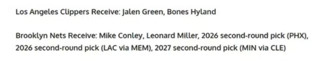篮网得到:康利、伦纳德·米勒、2026年第二轮选秀权(太阳)、2026年第二轮选秀权(快船)、2027年第二轮选秀权(森林狼);