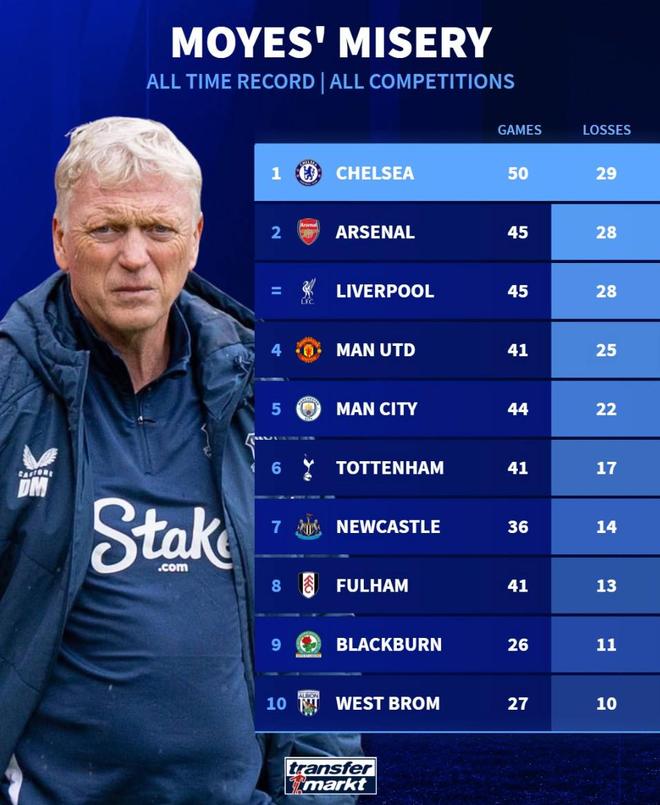 赛后来自德转的统计指出,这是莫耶斯教练生涯至今带队各项赛事50次对阵切尔西吃到的第29场败仗,蓝军也超越阿森纳和利物浦(28负)成为了这位苏格兰教头教练生涯至今输球场次最多的对手。